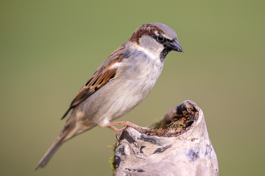 Oberseite rotbraun; grauer Scheitel; schwarzer Kehl- und Brustfleck.