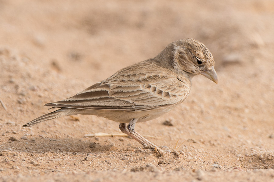 Kleine Lerche mit kräftigem, kegelförmigem Schnabel mit stark gekrümmtem First; keine Handschwingenprojektion. Sandbraune Oberseite; im Flug Unterflügel dunkel und Schwanzseiten schwärzlich.