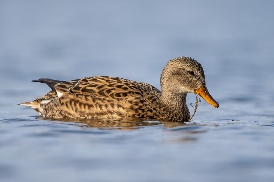 Sehr ähnlich dem Stockenten-Weibchen, abgesehen vom weissen Flügelspiegel am besten an den gleichmässig breiten, orangen Schnabelkanten zu erkennen.