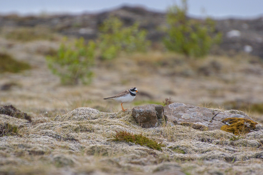 Graubraune Oberseite; weisse Unterseite; weisses Halsband und breites, dunkles Brustband; Beine orange.