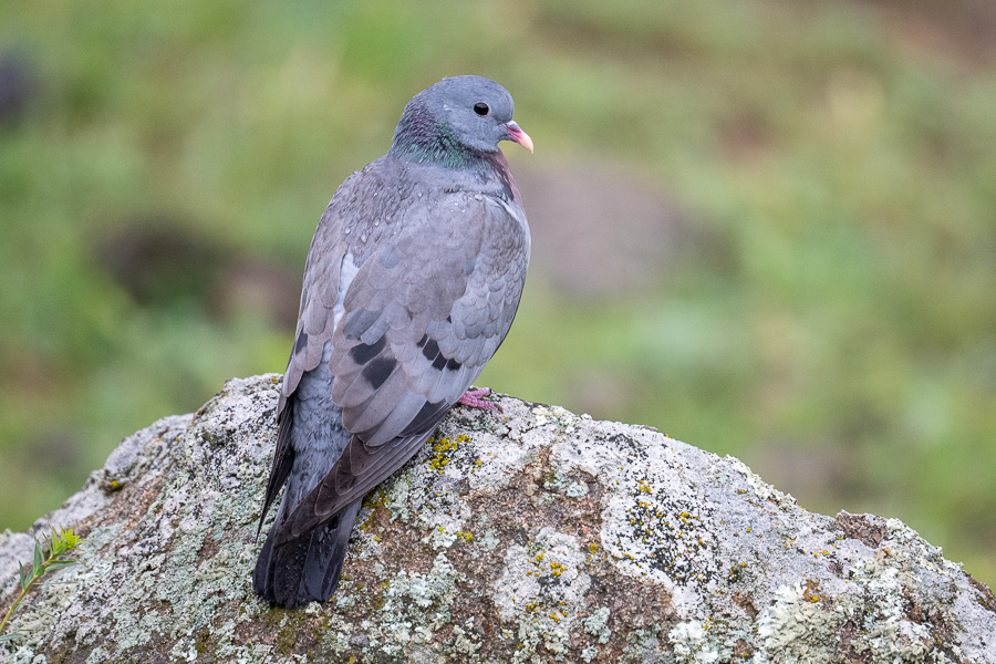 Etwas kleiner als die Ringeltaube; graues Gefieder mit zwei kurzen, schwarzen Flügelbinden und grün-violette schillerndem Halsseitenfleck.