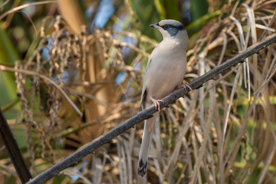 Elegante, langschwänzige Gestalt; beigegraues Gefieder; Männchen mit schwarzer Maske.