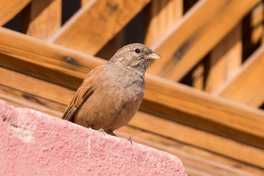 Überwiegend rotbraunes Gefieder; Kopf, Kehle und Brust grau; diffuses weiss-schwarz-graues Kopfmuster.
