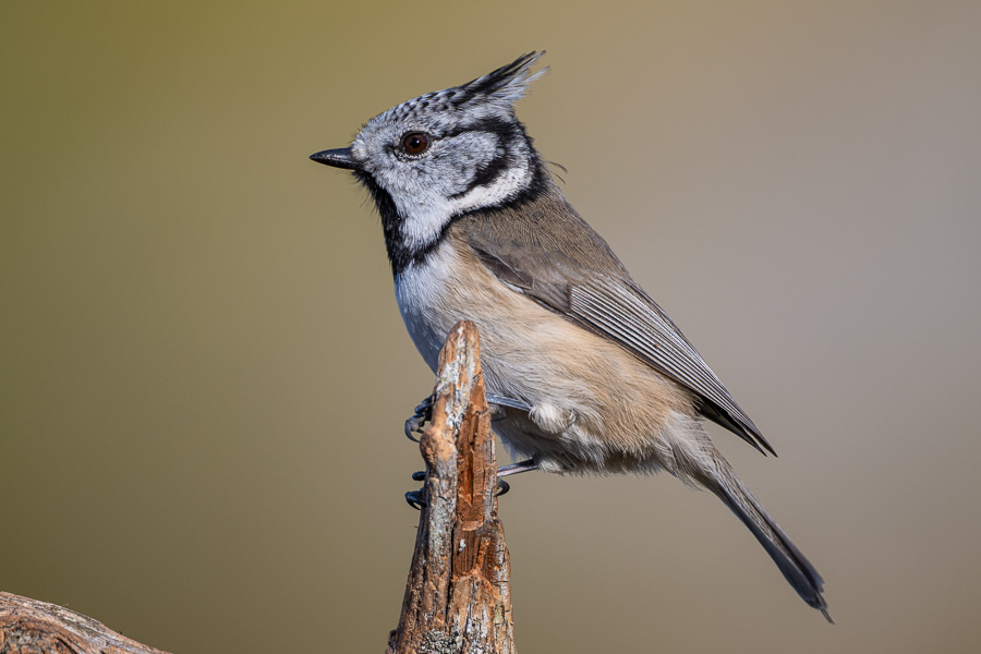 Weiss-schwarz gebänderte Federhaube auf dem Kopf; Oberseite graubraun, Unterseite bräunlichweiss.