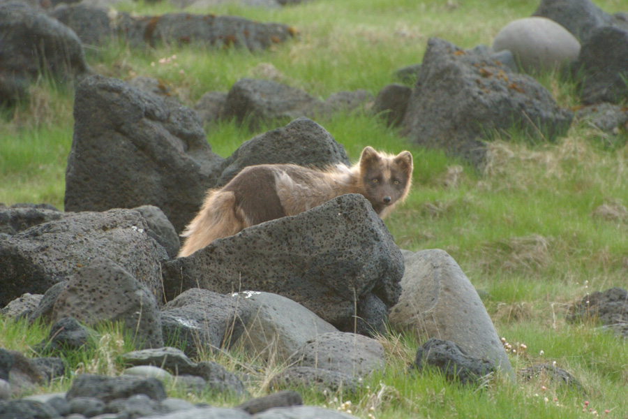 Ein erster Blick am Morgen aus dem Zimmerfenster über den Hafen brachte Arten wie Sterntaucher, Eiderente, Gryllteiste, Eismöwe und Eissturmvogel ein. Trotz regnerischem Wetter machten wir uns nach dem Frühstück auf Richtung Önðverðarnes im Snæfellsjökull-Nationalpark. In der dortigen Lava-Landschaft, die in einer Klippenküste endet, beobachteten wir unter anderem Basstölpel, Mantel- und Eismöwen. Ausserdem gabs ein Säugetier-Highlight: Ein Polarfuchs zeigte sich sehr schön zwischen den Felsbrocken. Später sahen wir auf dem Meer noch Kragenenten, zwei juvenile Eistaucher, eine Gryllteiste und eine Krähenscharbe. An den Klippen beim Leuchtturm brüteten nebst zahlreichen Dreizehenmöwen auch Tordalken, Trottel- und Dickschnabellumme.