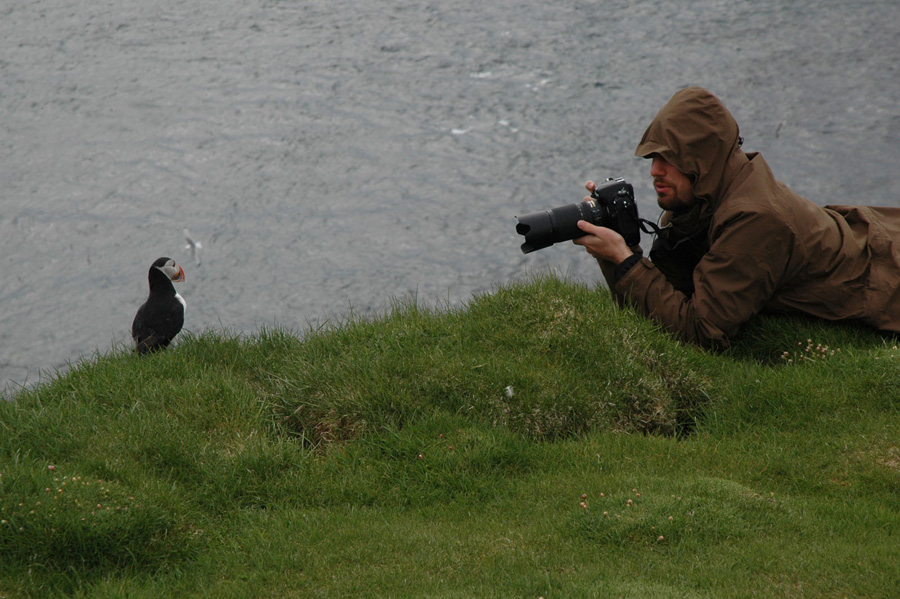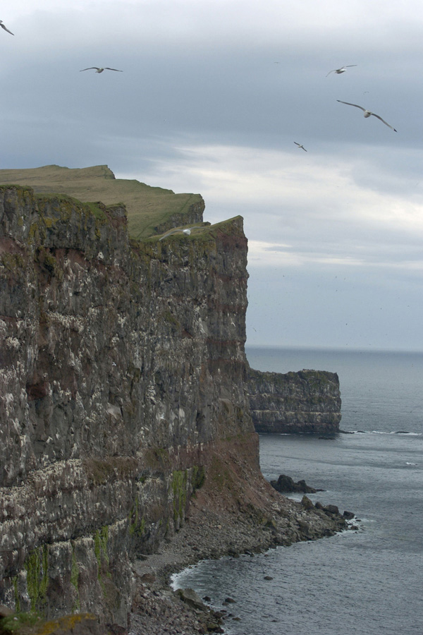 Nach dem Zimmerbezug gings wenige Kilometer weiter nach Látrabjarg. Die dortigen, bis zu 400 Meter hohen Klippen beherbergen riesige Vogelkolonien, unter anderem die weltgrösste Tordalkenkolonie. Es war ein sehr beeindruckendes Erlebnis - nebst der atemberaubenden Landschaft sahen wir aus nächster Nähe massenhaft Papageitaucher, Tordalken, Trottel- und Dickschnabellummen, Dreizehenmöwen und Eissturmvögel, einige Eis- und Mantelmöwen und Schmarotzerraubmöwen. Nachdem das Wetter sich verschlechterte und Regen einsetzte, begaben wir uns zurück ins Hotel.
