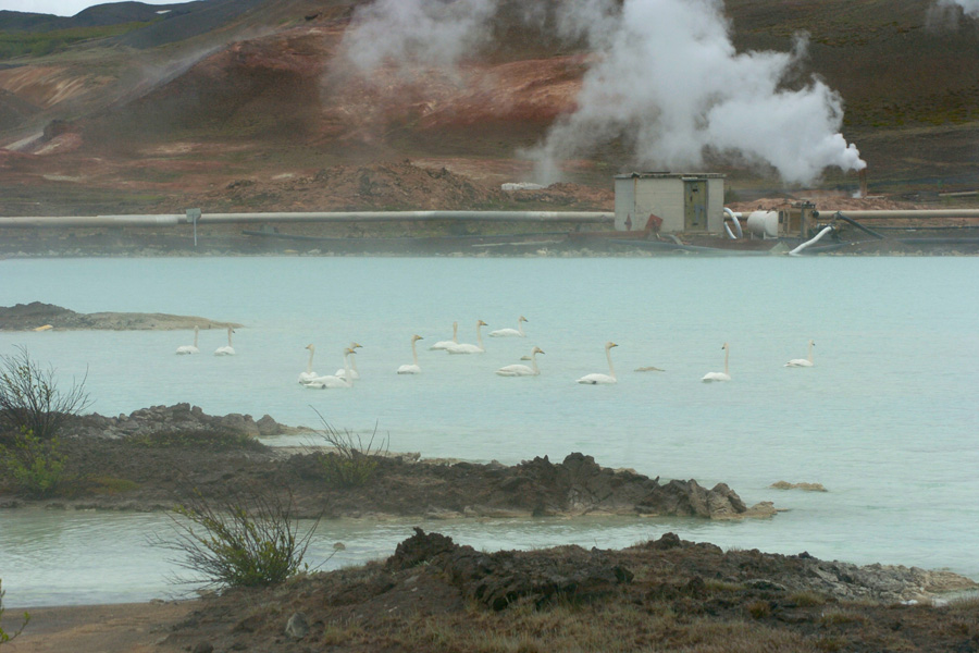 Danach besuchten wir noch das vulkanische Gebiet Námafjell mit seinen Solfataren und sprudelnden Schlammtöpfen, bevor wir in unserem Hotel eincheckten. Zum Abschluss des Tages gönnten wir uns ein Bad in der heissen Quelle des Mývatn Naturebath - absolut empfehlenswert! Und vor der Nachtruhe sahen wir aus dem Hotelzimmer noch einen Birkenzeisig mit seinem Jungen und ein paar Rotdrosseln.