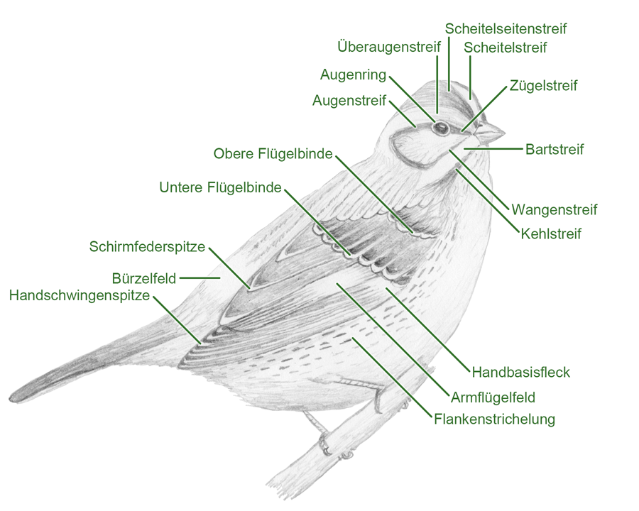 Nebst den Körperteilen und den Gefiederpartien werden bei den Beschreibungen von Vögeln auch Begriffe verwendet, die sich auf bestimmte, bei mehreren Arten auftretende Muster beziehen. Besonders wichtig sind hier die verschiedenen Kopfstreifen, daneben gibt es aber auch andere wichtige Zeichnungsmuster.